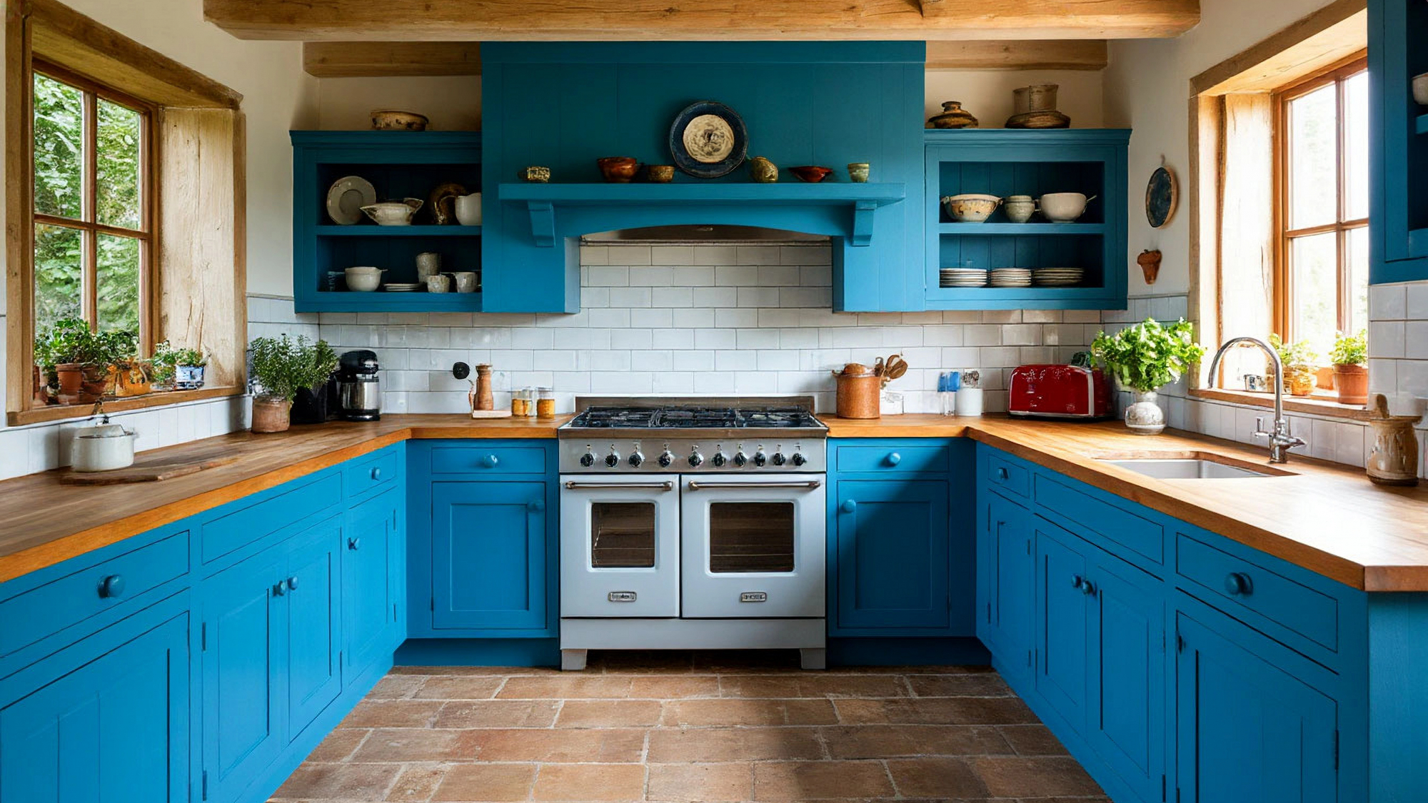 Фасады кухни выполнены из высококачественных материалов, которые подчеркивают насыщенность синего цвета и при этом обеспечивают долговечность и устойчивость к внешним воздействиям. Каждая деталь тщательно продумана: от аккуратной фурнитуры до пропорций шкафов и ящиков, которые идеально вписываются в пространство и создают гармоничный ансамбль. Синий цвет фасадов делает кухню одновременно яркой и стильной, при этом она не теряет теплоты и домашнего уюта, присущего кантри-стилю. Такой дизайн позволяет легко интегрировать кухню в интерьер дома, будь то просторная столовая, открытая гостиная или компактное пространство загородного коттеджа.