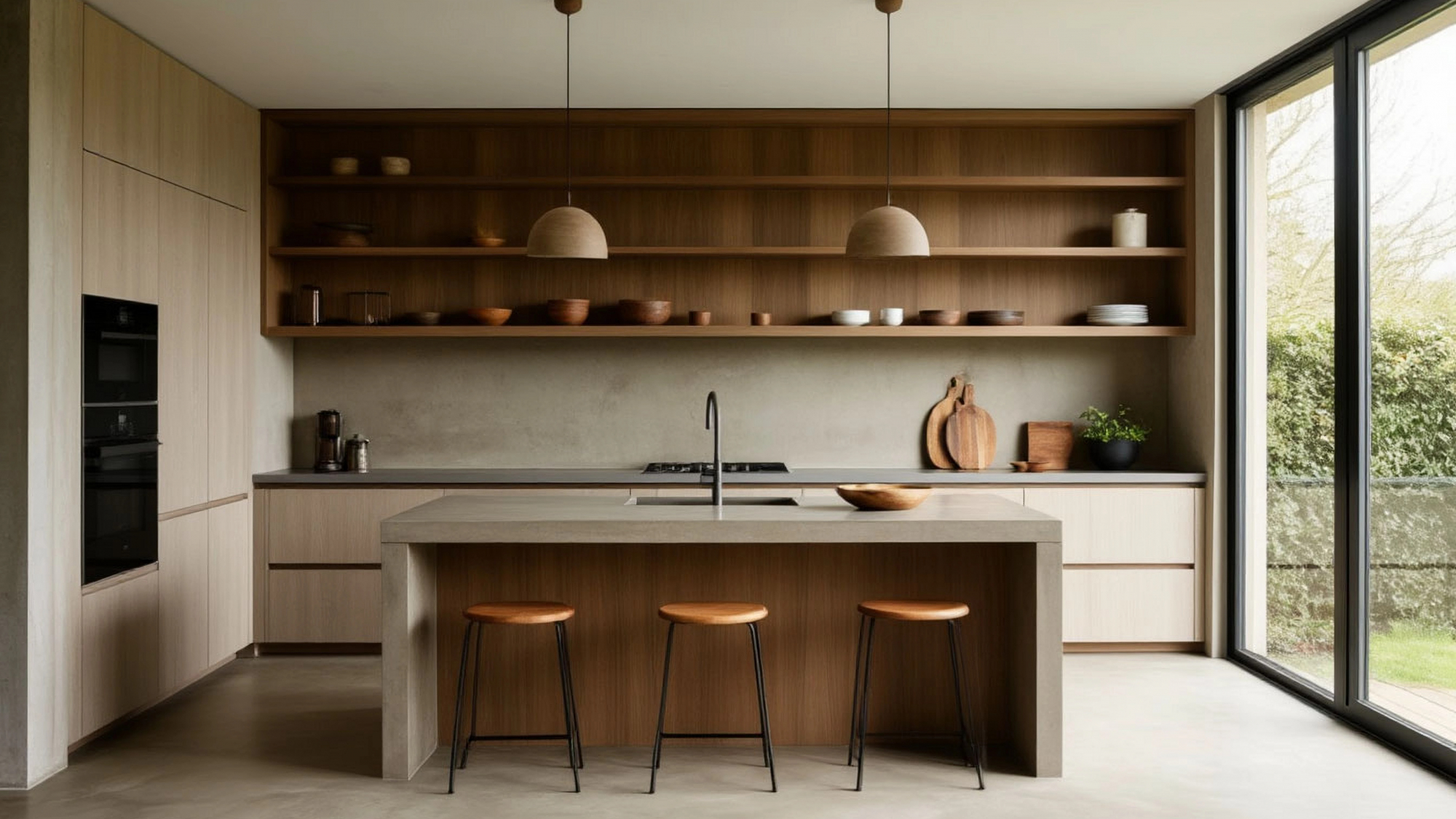 Особую атмосферу задает и фактура материалов. Матовый, мягкий оттенок фасадов кухни "Пудра" не отражает свет, а словно впитывает его, наполняя интерьер спокойствием. Дерево на полках делает пространство теплым и естественным, добавляя глубину за счет своего живого рисунка. Контраст матовой столешницы и теплой древесины создает гармоничный визуальный баланс. Все элементы кажутся спокойными, чуть теплыми и благородно сдержанными. Это не та кухня, которая стремится удивить яркими акцентами; наоборот — она удивляет именно своей мягкой, уверенной простотой.