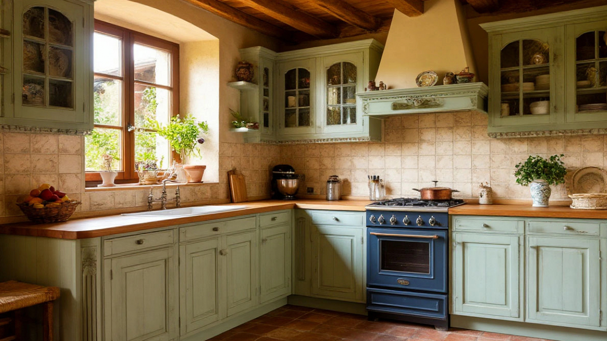 Детали интерьера подчеркивают стиль и характер кухни. Декоративные резные элементы на фасадах, изящные ручки, аккуратные молдинги и открытые полки создают атмосферу легкости и природной гармонии. Контраст между светло-зеленым фасадом и элементами из дерева добавляет глубины, а точечное освещение усиливает ощущение уюта и тепла.