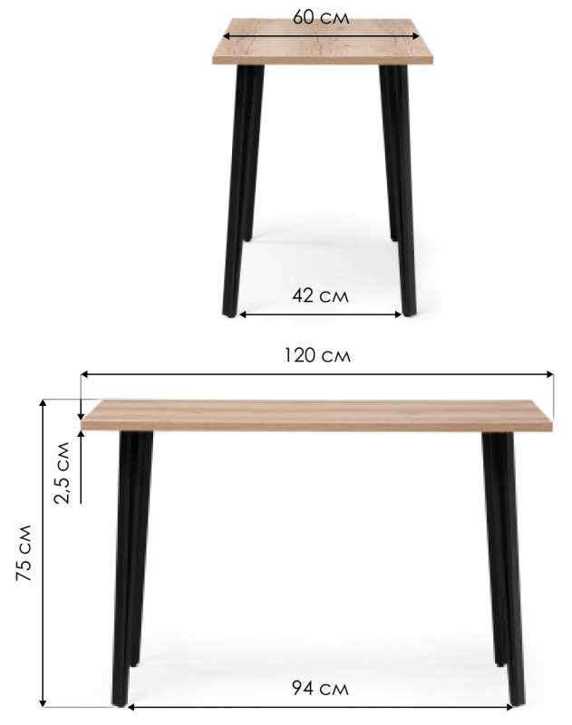 Толщина столешницы: 25 мм. Расстояние между ножками: 94,5 см.
