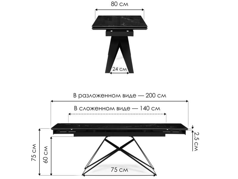 Расстояние между ножками: 75 х 24 см. Толщина столешницы: 2,5 см.